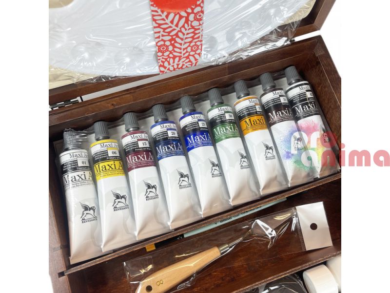 Открийте света на акрилната живопис с комплекта Renesans Maxi Acril! Всичко необходимо за създаване на шедьоври, събрано в елегантен дървен куфар.