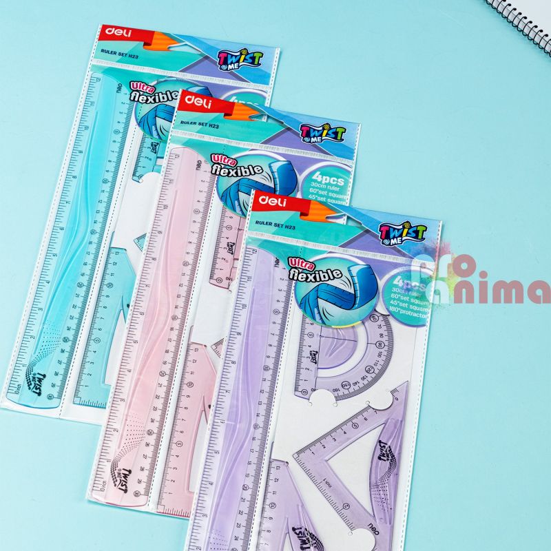 Чертожен комплект Deli Twist Me Flexible- линия 30 cm, 2 триъгълникa, транспортир, цветни