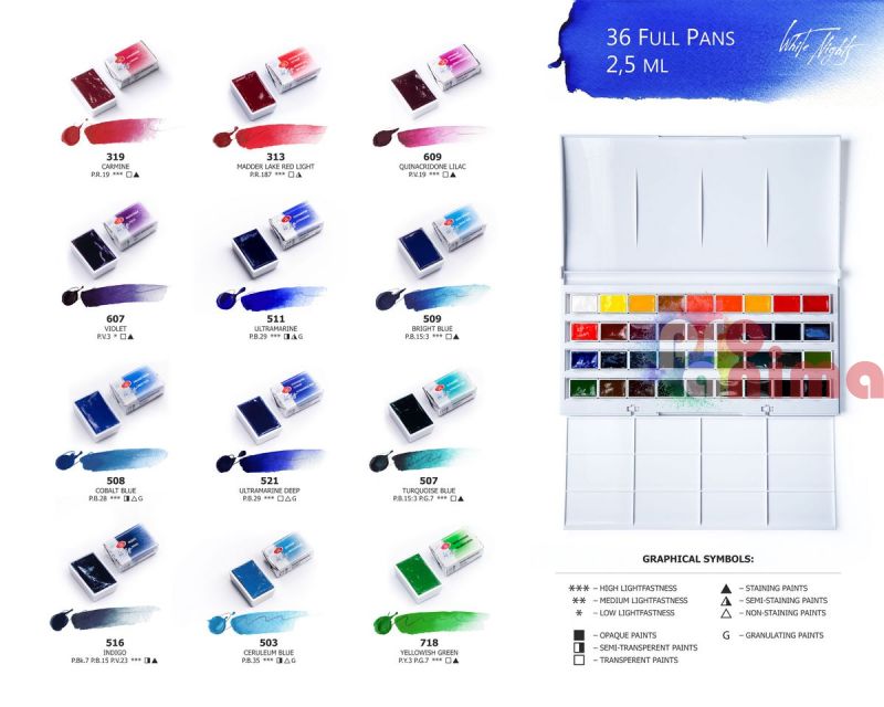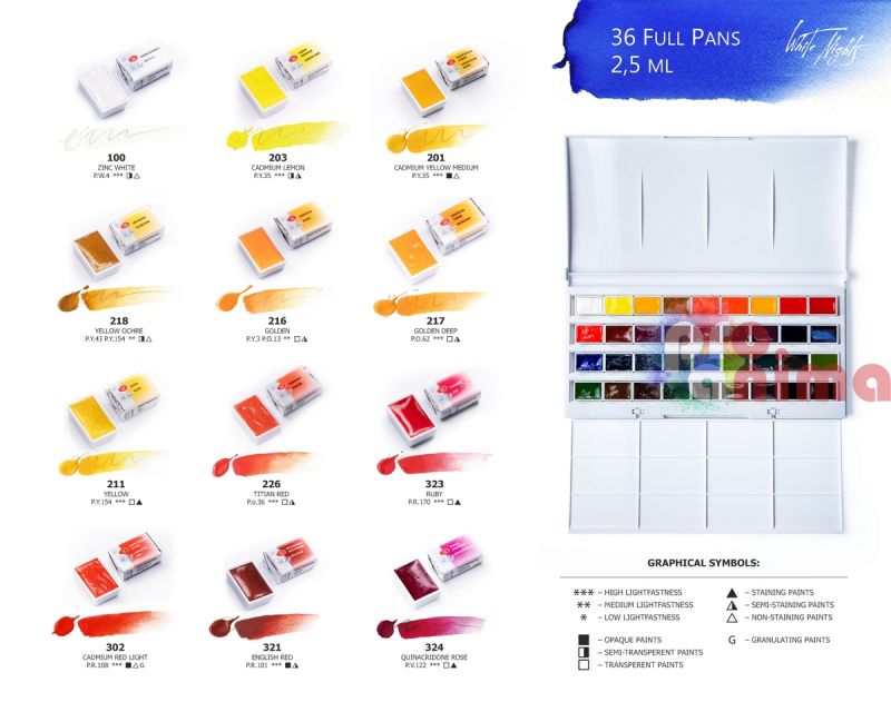 Комплектът акварелни бои за живопис "Бели нощи" включва 36 цвята индивидуално опаковани блокчета акварел по 2.5 ml. Боите са произведени на основата на висококачествени пигменти и свързващи вещества, благодарение на които цветовете постигат нужните качества като прозрачност, интензивност и чистота на цвета. Високата концентрация на пигмент осигурява максимална интензивност на цветовия тон. Цветовете позволяват смесване, което ви позволява да получите богато разнообразие от нюанси.