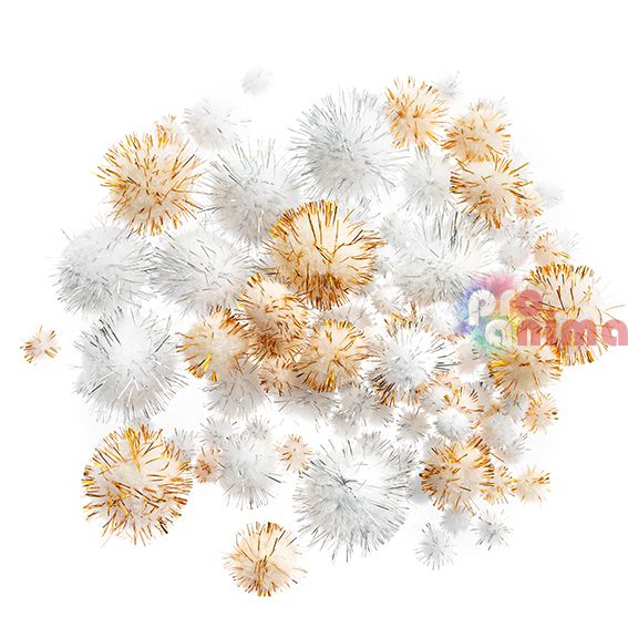 Пухкави и меки декоративни помпони от полиестер в златни и сребърни нюанси с глитер (блестящ) ефект. Подходящи са за изработка на картички, скрабук (албуми), подаръчни опаковки и много други. Също така биха могли да се превърнат в изключително забавно занимание за Вашето дете - направа на животни, хора и други създания.