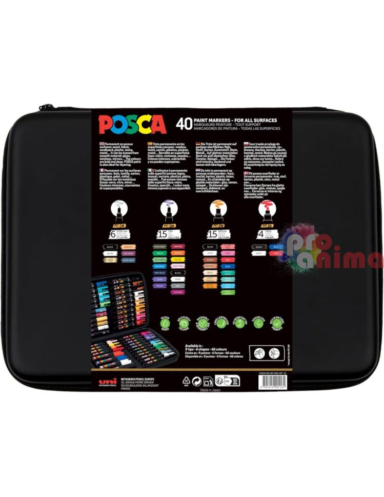 Комплект акрилни маркери POSCA 40 цвятa в голям несесер, подходящи за рисуване върху стъкло, метал, дърво, хартия, текстил, керамика, пластмаса, плат и др.