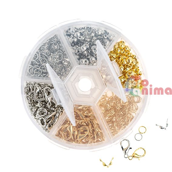 Комплект златисти и сребристи елементи подходящи за изработване на бижута - обeци, гривни, колиета, колани, ключодържатели и др. Комплектът включва: халки за свързване, мини закопчали (карабини) и скобички.
