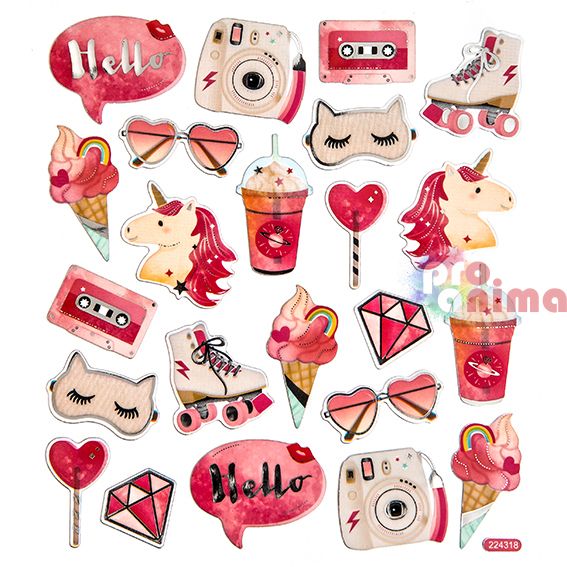 Разнообразни стикери "Розови джажди" (ролери, близалки, очила, ролкови кънки, еднорози, диаманти и др. в различни нюанси на розовото) от DP Craft – идеален избор за декорация и творчески проекти! Стикерите с глитер ефект могат да бъдат както ефектна декорация в детската стая, така и елементи за украса на различни предмети, напр. тетрадки или рамки на снимки.