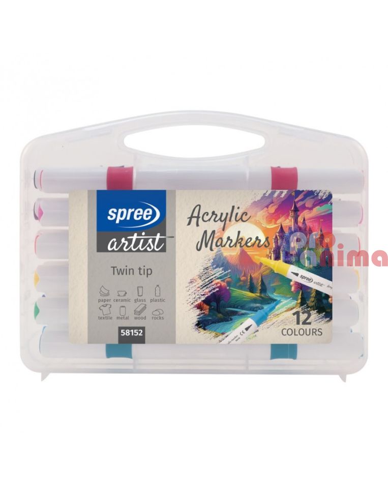 Разнообразие от 12 наситени цвята: Комплектът включва 12 ярки и наситени цвята, които ще вдъхнат живот на вашите проекти. Акрилните маркери Spree са подходящи за рисуване върху различни повърхности, включително хартия, картон, платно, дърво, камък, пластмаса и дори текстил.