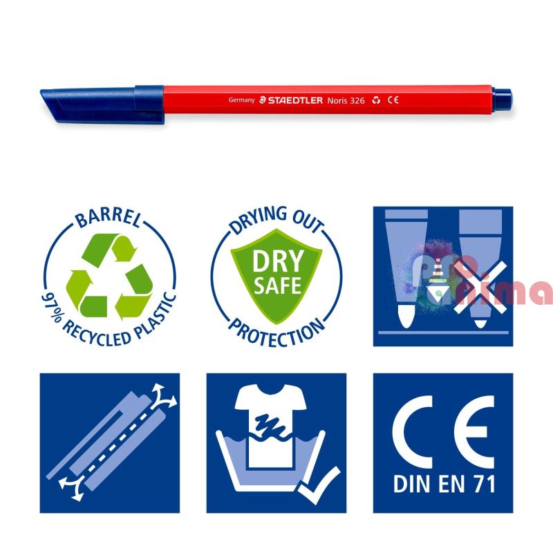 Безопасни за деца: Флумастерите Staedtler Noris 326 са създадени с мисъл за безопасността на децата. Мастилото е на водна основа и лесно се изпира от повечето тъкани, което ги прави подходящи за използване в училище, вкъщи и по време на творчески занимания.