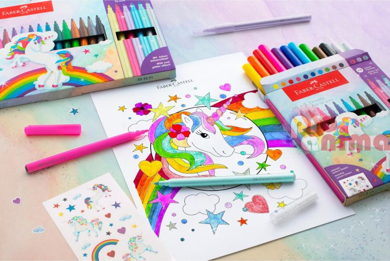 Комплект флумастери Faber-Castell Еднорог, подходящи за рисуване и оцветяване.