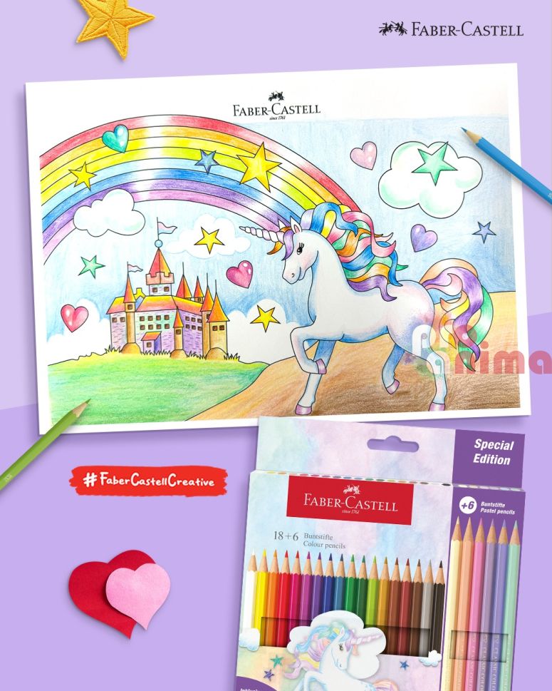 Цветни моливи Faber-Castell Еднорог, 18+6 цвята и стикери