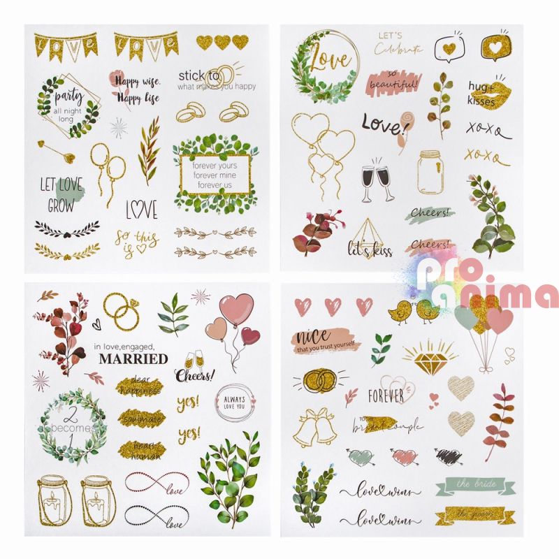 - Комплектът включва 4 големи листа с приблизително 80 бр. стикери: от малки мотиви със сърца, гълъби и брачни халки до по-големи флорални мотиви, балони и произволни фрази;
