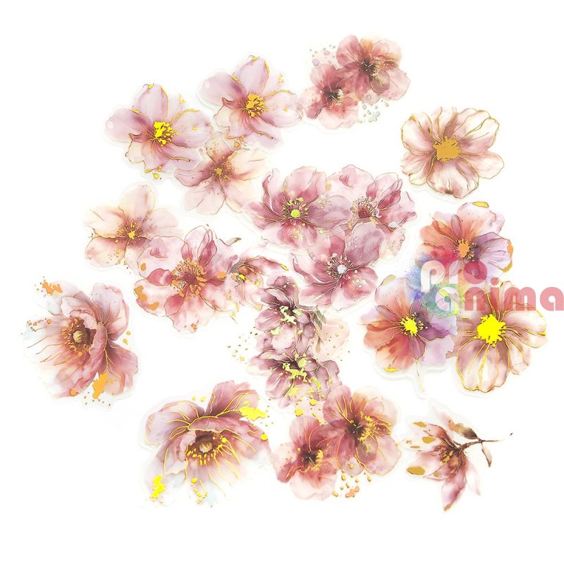 Стикери от прозрачно PET фолио, цветя, 20 бр., розов руж, блестящи