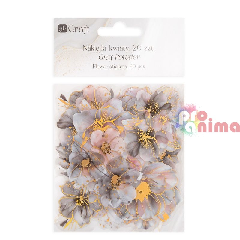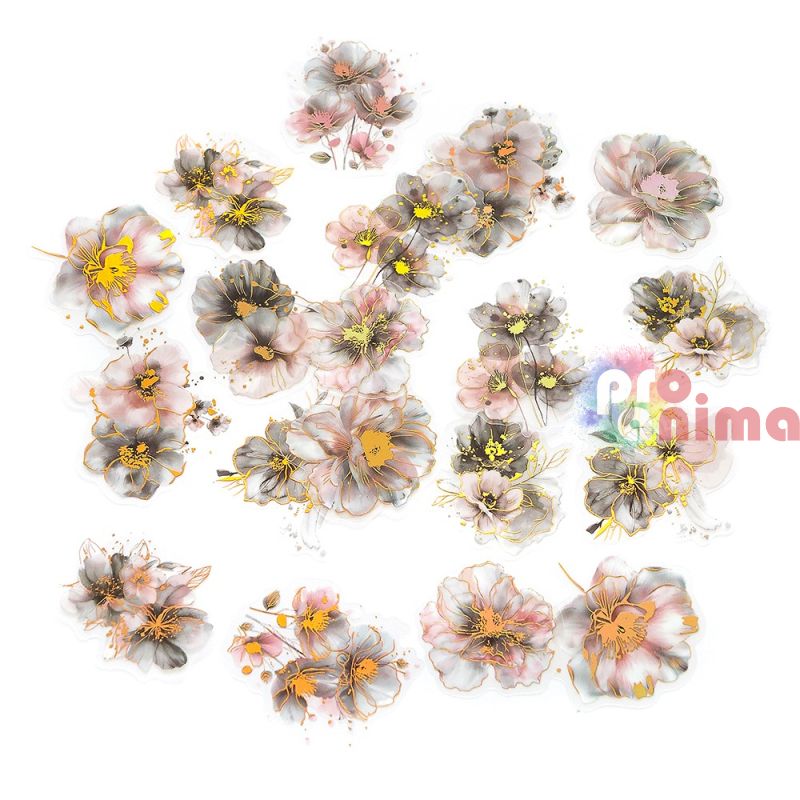 Стикери от прозрачно PET фолио, цветя, 20 бр., сива пудра, блестящи