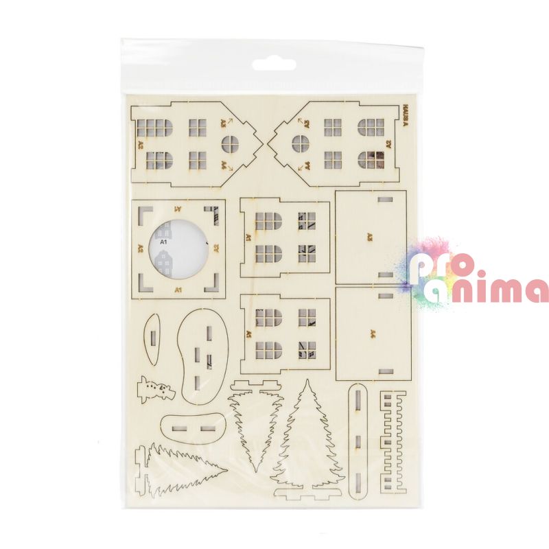 Креативен комплект за декорация Дървена къща, елхи и снежен човек, за сглобяване, 16 части