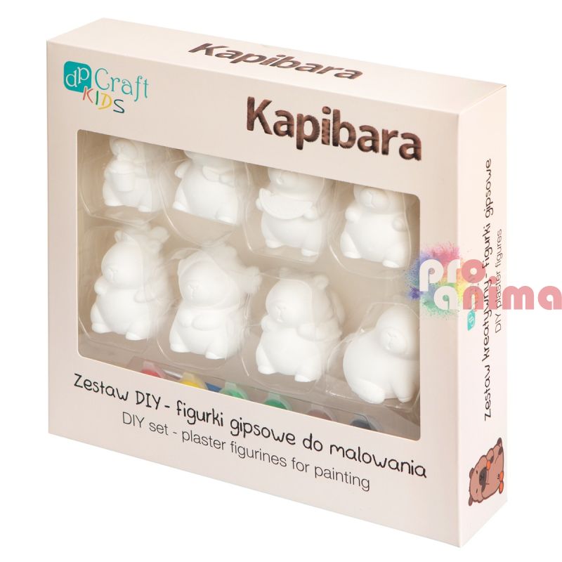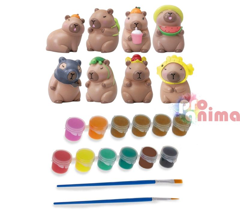 Забавен и креативен комплект от 8 бр. гипсови фигурки под формата на сладки капибари. Комплектът е подходящ за разпалване на въображението и развиване на фината моторика при всички малки творци, а готовите фигурки могат да се използват като декорация на детската или класната стая.