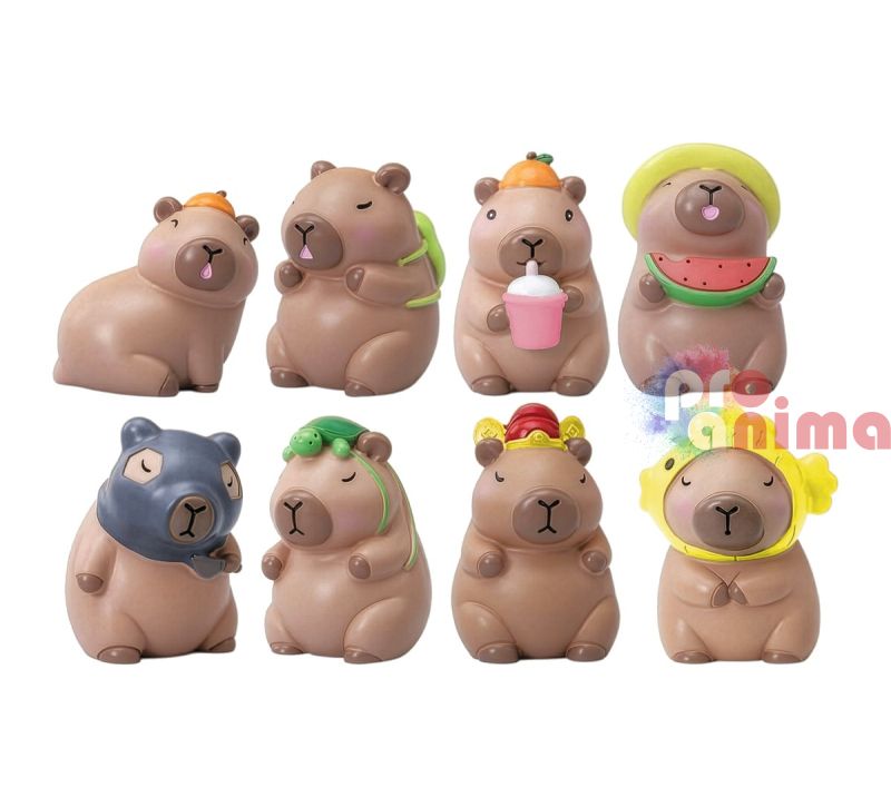 - 8 бр. различни гипсови фигурки капибара с размер 6.5 x 4.5 cm;