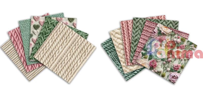 - Мотив: нежни, пастелни цветове (пудра розово, зелено и топли бежови нюанси), комбинирани с фини шарки наподобяващи пуловери;