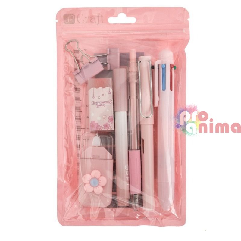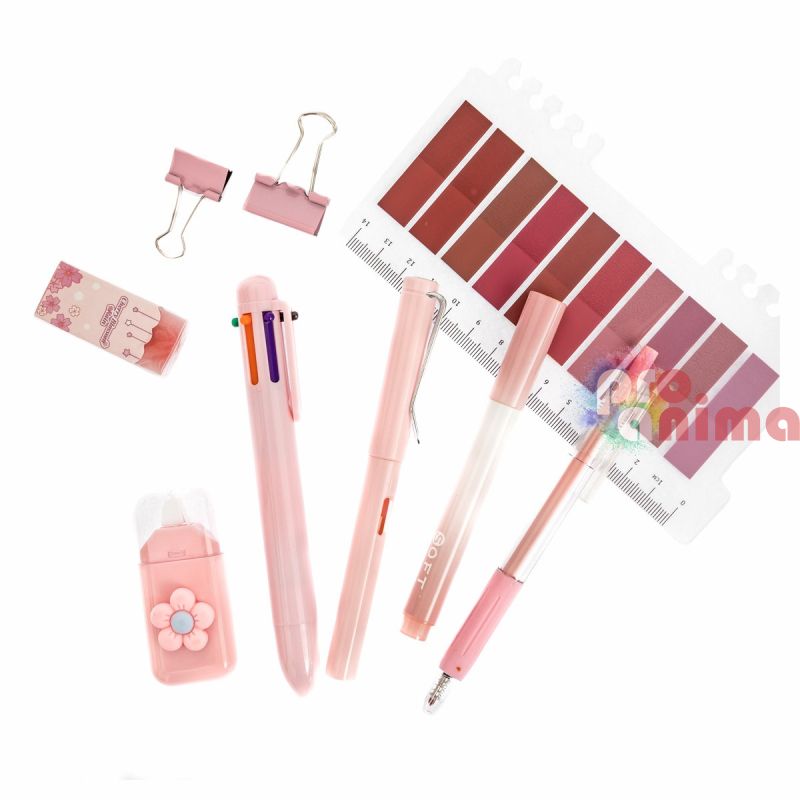 Стилен и практичен комплект от 9 бр. основни пособия в нежен пастелно розов цвят, подходящ за училище, офис, университет или домашно бюро. Аксесоарите са леки, удобни и практични за ежедневна употреба.
