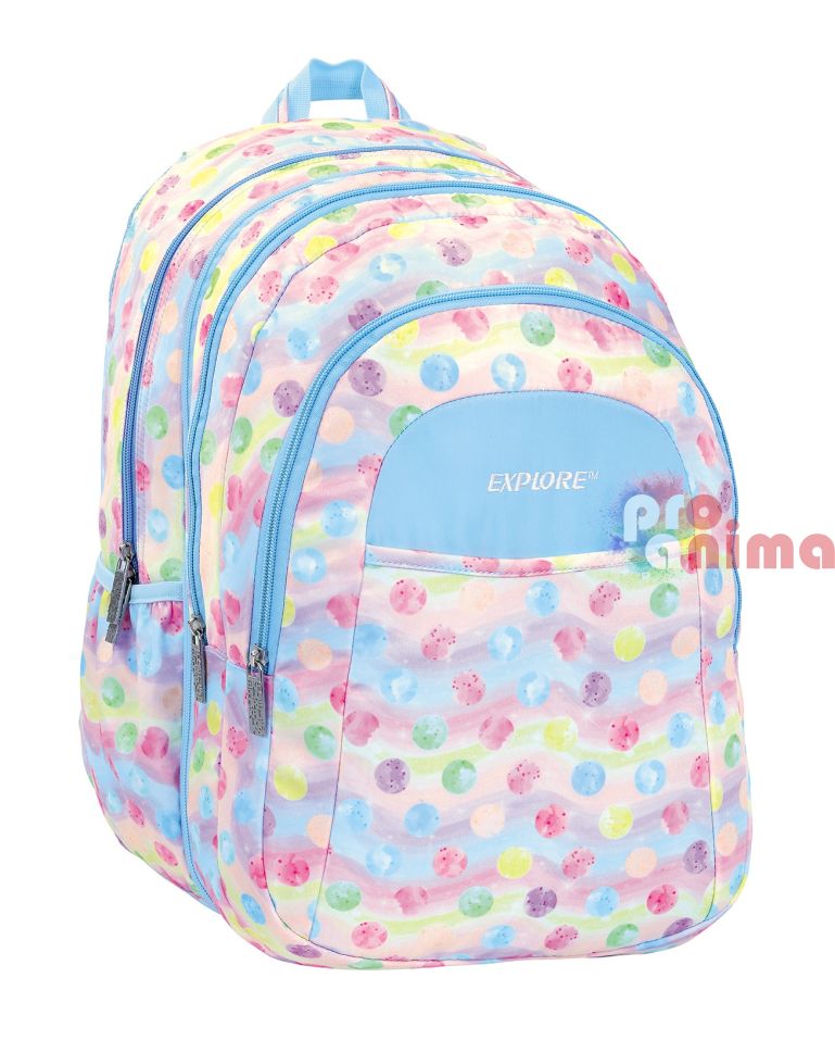 Ергономичната раница за училище Explore Polka Dots 2 в 1 е здрава, красива и комфортна. Практичността на модела- "две раници в една" я прави подходяща за училище, спорт, курсове и др., а анатомичният ѝ дизайн и отлично разпределение - идеална и за по-малките ученици.