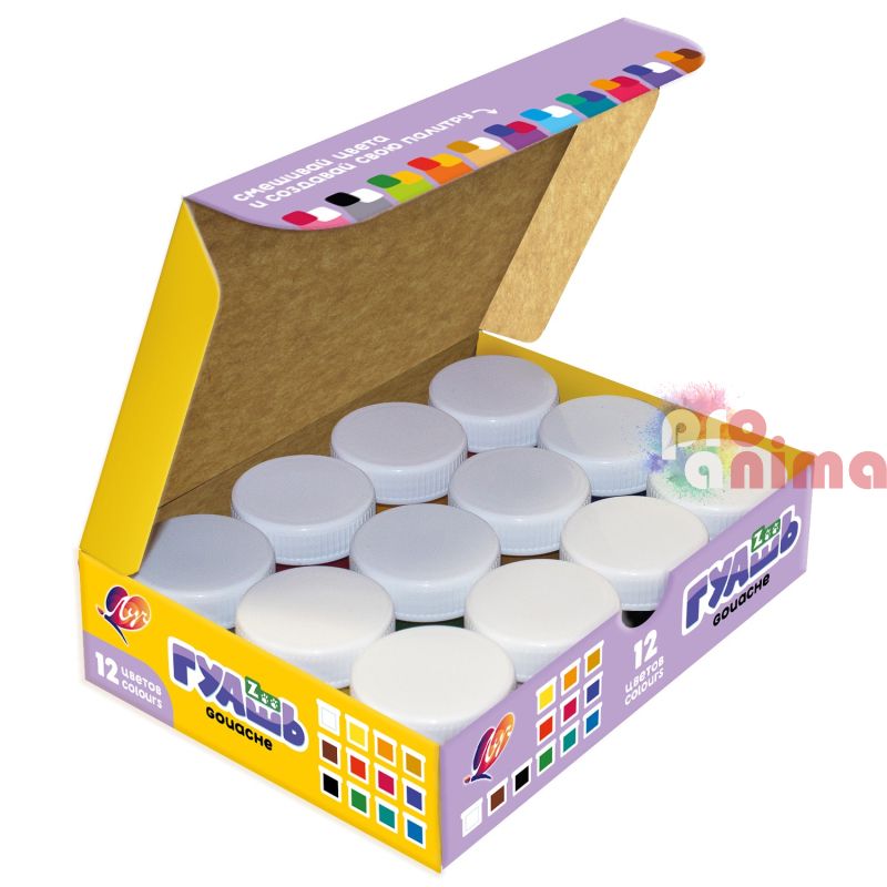 Темперни бои / гваш за деца Луч Zoo, 12 цвята, в бурканчета