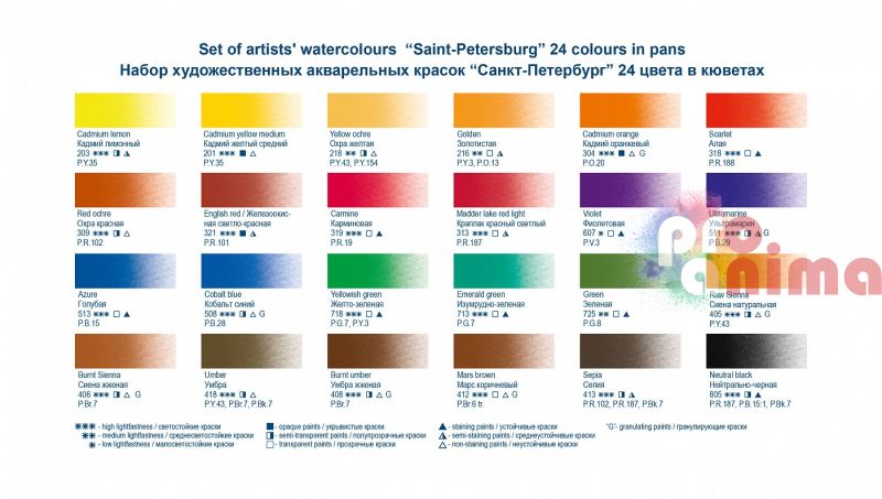 Комплектът акварелни бои за живопис Санкт Петербург включва 24 цвята индивидуално опаковани блокчета акварел по 2.5 ml. Боите са произведени на основата на висококачествени пигменти и свързващи вещества, благодарение на които цветовете постигат нужните качества като прозрачност, интензивност и чистота на цвета.