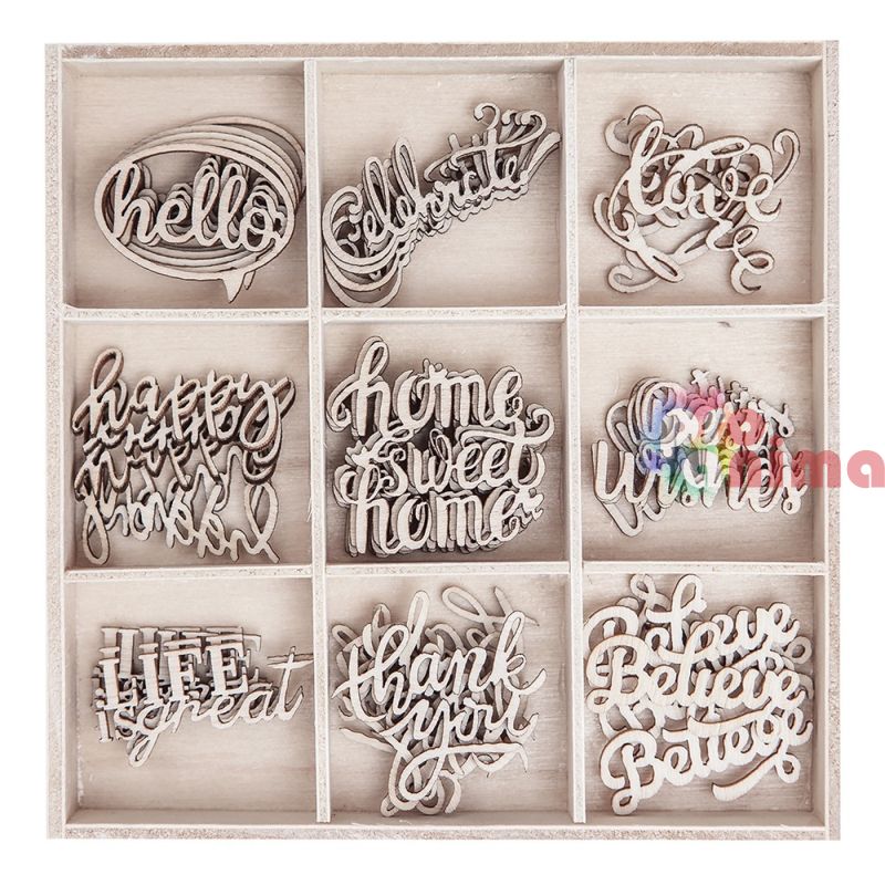 - Дървената кутия съдържа 45 фигурки в 9 различни дизайна ("Love", "Happy", "Home sweet home", "Life is great", "Believe", "Best wishes" и "Thank you").