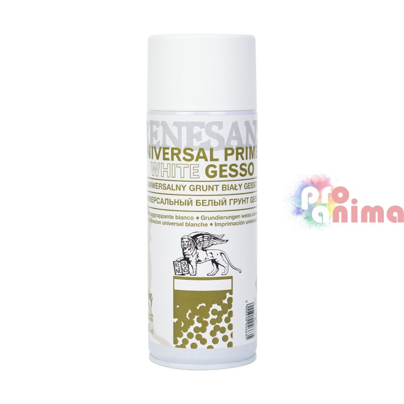 Универсалният спрей за грундиране Renesans - бяло гесо, позволява лесно и равномерно да грундирате различни повърхности (вкл. стъкло и пластмаса, където нанасянето с четка е трудно). Грундът създава защитен филм върху грундираната повърхност, който не позволява абсорбирането и подобрява свързването на боята.